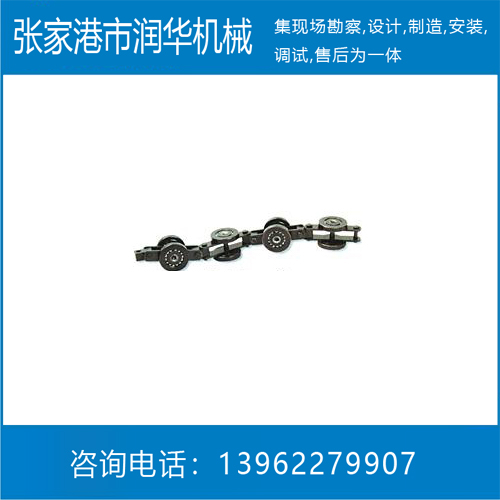 产品名称:TXJ240 50kg产品参数:链条节距:t=240mm走轮直径:66×11.5mm导轮直径:68×15mm链板厚度: 5mm销轴直径:10.5mm链条重量:10.5Kg/m轨道重量:8.12Kg/m单点吊重:50kg轨道截面尺寸:80×80×25×4mm许用张力:800kg回转半径:R600mm垂直回转半径:R600mm链条速度:V=0.5~15m/min工作温度:-20—200°产品介绍:广